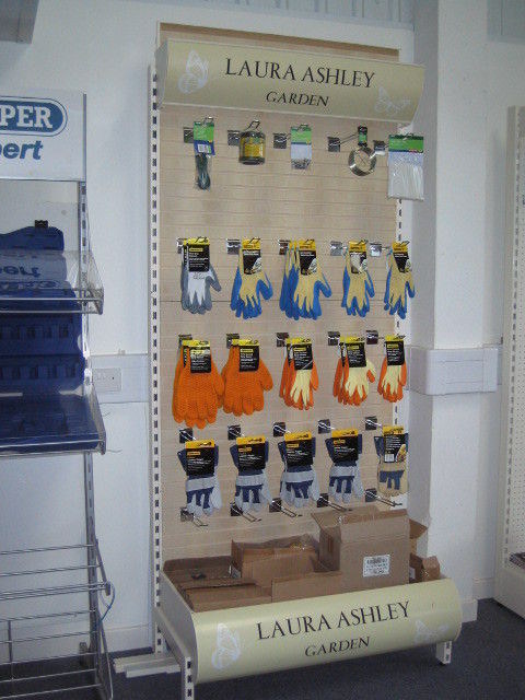 Één zij de tribunerek van de slatwallvertoning voor het tentoonstellen van en het bevorderen van een verscheidenheid van handschoenen en kleine goederen