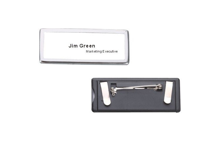 Nama aluminium lencana dengan aluminium depan wajah dan plastik kembali. Aluminium wajah dapat dioksidasi untuk warna apapun. Warna yang paling populer adalah perak dan emas. Orang-orang dapat mencetak nama mereka dan memasukkan ke dalam lencana nama. Kebesaran nama lencana adalah daerah pencetakan 66.5X26.5mm.The adalah 20X59mm.There dua pilihan untuk klip pada kain: peniti dan klip.